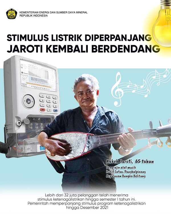 Di saat seperti ini, Kakek Jaroti mengungkapkan, keringanan pembayaran listrik yang ia terima dirasa sangat membantu. Sebagai pelaku Usaha Mikro, Kecil, dan Menengah (UMKM) yang berlangganan listrik golongan Industri 900 VA, Kakek Jaroti mendapatkan keringanan biaya beban atau abonemen 50% dari pemerintah. Keringanan biaya abonemen juga diperuntukkan bagi pelanggan listrik PT PLN (Persero) golongan Bisnis 900 VA, serta Sosial 220 VA hingga 900 VA.