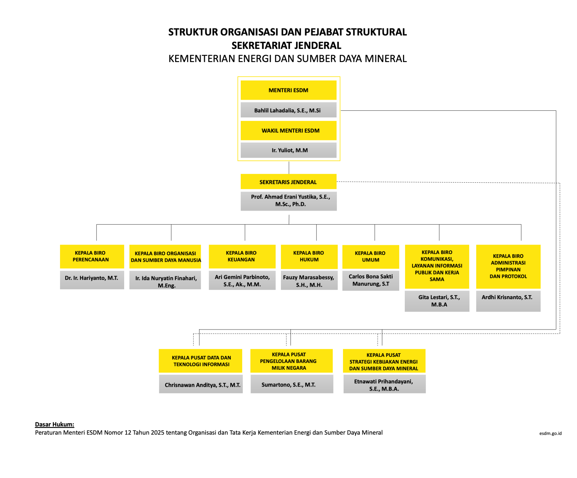 Sekretariat Jenderal mempunyai tugas menyelenggarakan koordinasi pelaksanaan tugas, pembinaan, dan pemberian dukungan administrasi kepada seluruh unsur organisasi di lingkungan Kementerian ESDM. Dalam melaksanakan tugas sebagaimana dimaksud, Sekretariat Jenderal menyelenggarakan fungsi: