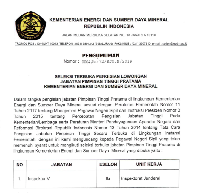 Dengan ini kami mengundang kepada Pegawai Negeri Sipil yang telah memenuhi syarat untuk mengikuti seleksi terbuka jabatan Pimpinan Tinggi Pratama di lingkungan Kementerian ESDM, yaitu: