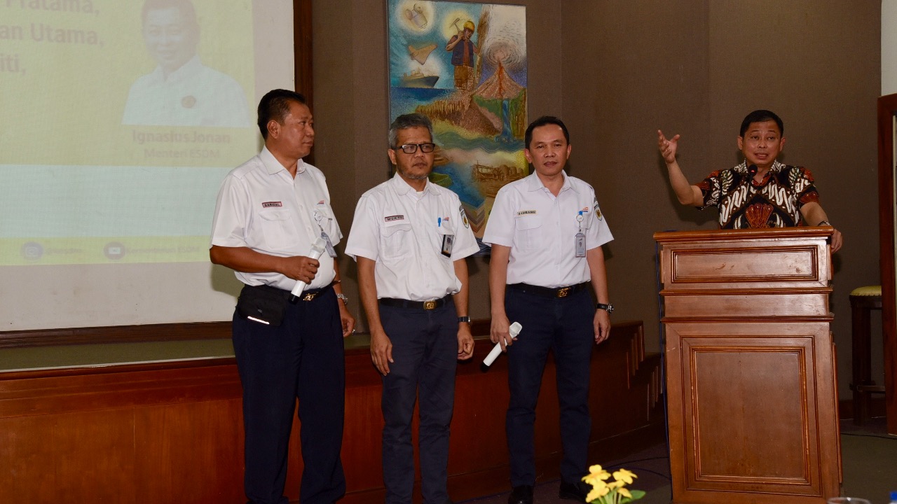 Usai memberikan pengarahan kepada para Pejabat Tinggi Pratama dan Pejabat Fungsional di Badan Geologi, Sabtu (4/8), Menteri Energi dan Sumber Daya Mineral (ESDM) Ignasius Jonan mengundang tiga mantan rekan kerjanya di PT Kereta Api Indonesia, yakni Kepala Daerah Operasi 2 Jawa Barat Saridal, Direktur Logistik dan Pengembangan PT KAI Bambang Eko Martono, dan Corporate Deputy Director Passenger Commercial Marketing and Sales Mukti Jauhari untuk berbagi pengalaman dalam membenahi dunia perkeretaapian Indonesia.