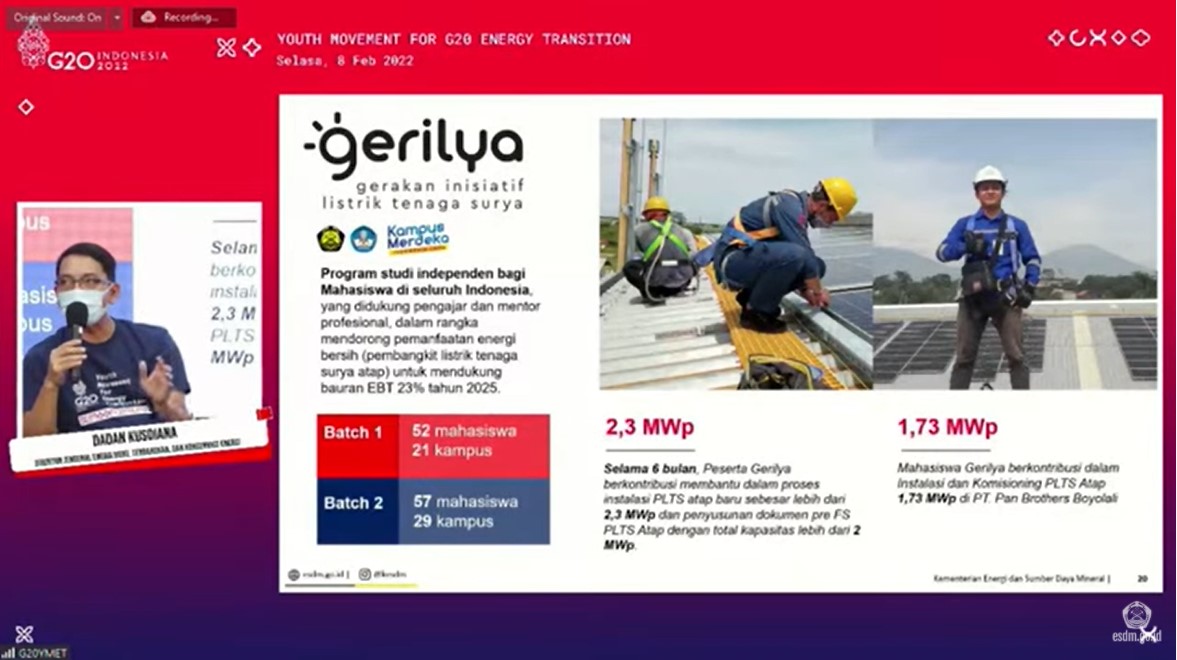 Pelaksanaan program Gerakan Inisiatif Listrik Tenaga Surya (Gerilya) memberikan kontribusi nyata bagi percepatan pembangkit listrik berbasis energi baru dan terbarukan. Hal ini disampaikan secara langsung oleh Direktur Jenderal Energi Baru, Terbarukan, dan Konservasi Energi (EBTKE) Dadan Kusdiana, pada. acara Youth Movement for G20 Energy Transition di Jakarta, Selasa (8/2).