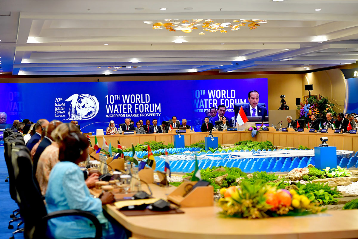 Presiden Jokowi memaparkan upaya Indonesia dalam memperkuat infrastruktur airnya selama dekade terakhir, termasuk pembangunan 42 bendungan, 1,18 juta hektare irigasi, 2.156 kilometer pengendali banjir dan pengaman pantai, serta merehabilitasi 4,3 juta hektare jaringan irigasi.