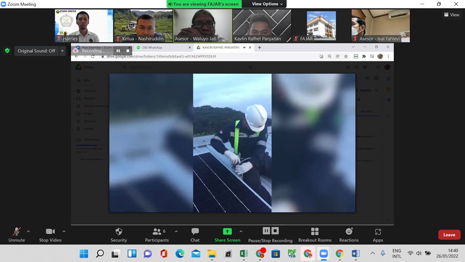 Penyelenggaraan uji kompetensi PLTS dilaksanakan selama 3 (tiga) hari, pada tanggal, 26 sampai dengan 28 Januari 2022 secara online melalui aplikasi zoom. Sebagai Tim Asesor Ketua Muhammad Nashiruddin Haramaini, Anggota Raden Waluyo Jati Soemowidagdo, dan Oktasio Fahlevi dari LSK PPSDM KEBTKE.