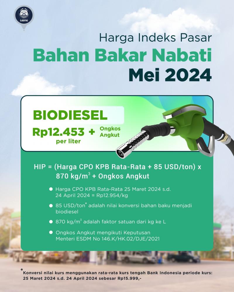 Selain menetapkan Harga Indeks Pasar (HIP) Bahan Bakar Nabati (BBN) Bioetanol, Direktorat Jenderal Energi Baru, Terbarukan, dan Konservasi Energi (EBTKE) Kementerian Energi dan Sumber Daya Mineral (ESDM) juga menetapkan HIP BBN jenis Biodiesel untuk bulan Mei 2024 sebesar Rp12.453 per liter.