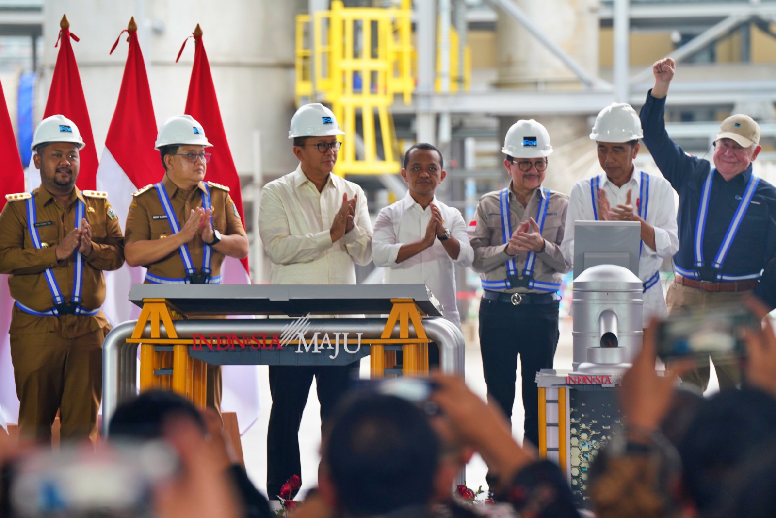 Presiden Joko Widodo meresmikan produksi smelter PT Freeport Indonesia (PTFI) yang berlokasi di Kawasan Ekonomi Khusus (KEK) Gresik JIIPE, Gresik, Jawa Timur pada Senin (23/9). Dalam acara ini, Presiden Jokowi didampingi oleh Menteri Energi dan Sumber Daya Mineral (ESDM) Bahlil Lahadalia yang turut berperan dalam mendorong hilirisasi industri tambang sebagai bagian dari kebijakan strategis pemerintah.