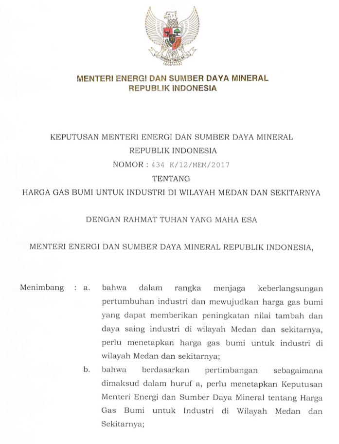 Kepmen ESDM Nomor 434 Tahun 2017 tentang Harga Gas Bumi untuk Industri di Wilayah Medan dan Sekitarnya