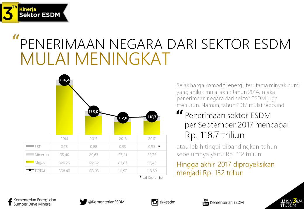 Capaian tersebut lebih tinggi dibanding tahun sebelumnya yang berada pada angka Rp 111,97 T. Penerimaan Negara dari ketiga subsektor ESDM diproyeksikan meningkat kembali hingga akhir tahun 2017, masing-masing mencatatatkan angka sebagai berikut: Migas Rp 118,44 T, EBT Rp 0,66 T dan Minerba pada nilai Rp 32,40 T.