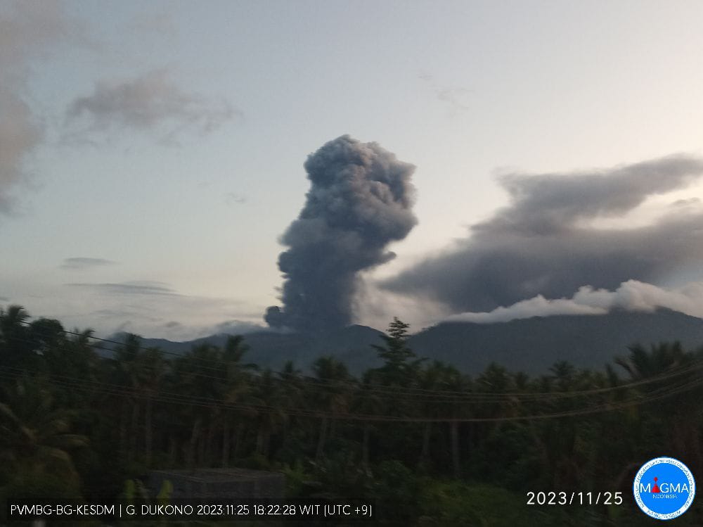 "Aktivitas G. Dukono hingga tanggal 25 November 2023 tercatat antara lain, terjadi peningkatan aktivitas erupsi vang secara visual signifikan vaitu meningkatnya ketinggian kolom letusan yang menjadi lebih dari 2.000 meter diatas puncak. Pada tanggal 18 November 2023 kolom erupsi mencapai 3.000 meter dan pada tanggal 25 November 2023 kolom erupsi dilaporkan mencapai 2.600 meter diatas buncak," ujar Kepala Pusat Vulkanologi Dan Mitigasi Bencana Geologi (PVMBG) Badan Geologi Kementerian ESDM Hendra Gunawan, Minggu (26/11).