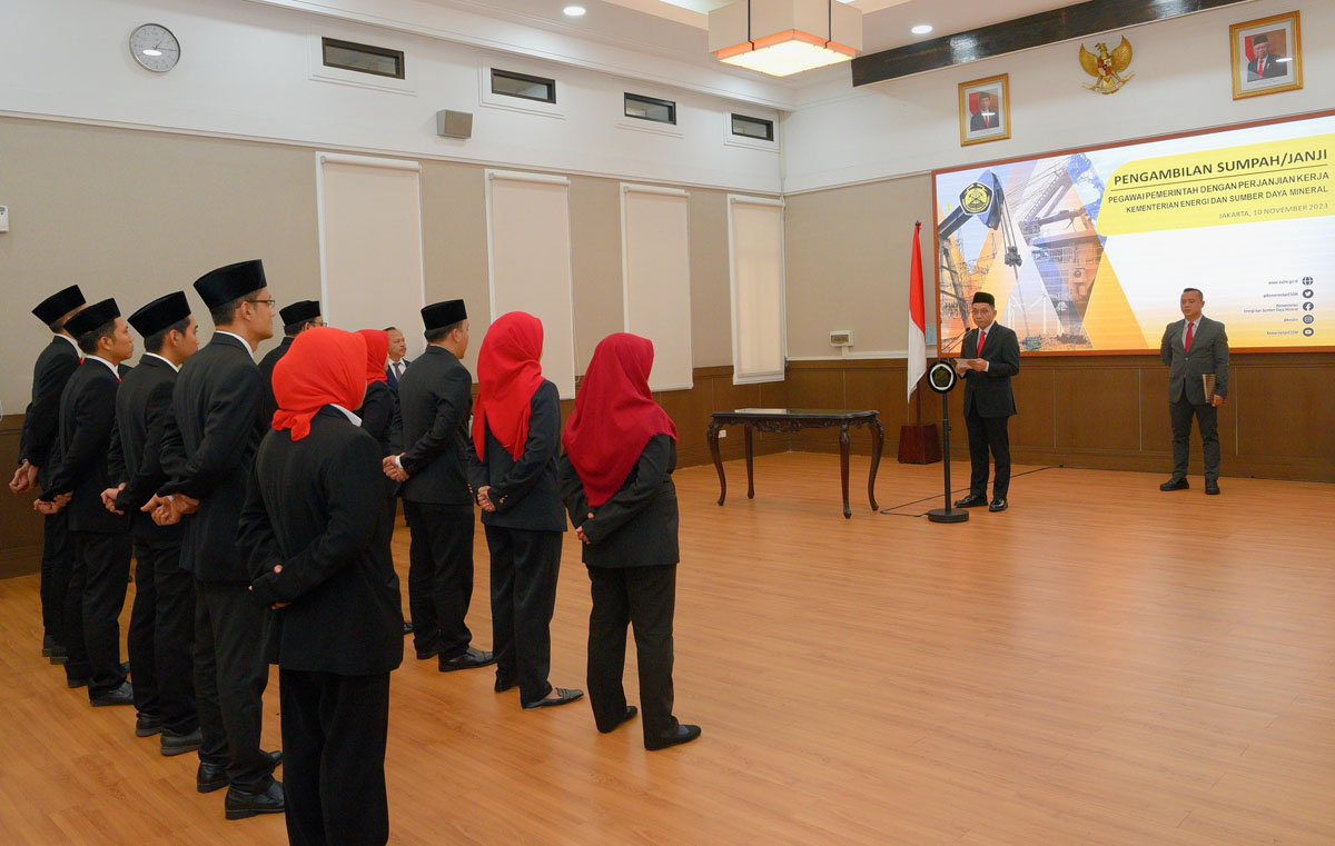 13 Pegawai Pemerintah dengan Perjanjian Kerja (PPPK) hari ini, Jumat (10/11), diambil sumpahnya karena telah memenuhi semua persyaratan untuk dapat diangkat menjadi PPPK. Sekretaris Jenderal Kementerian Energi Dan Sumber Daya Mineral (ESDM) Dadan Kusdiana menyampaikan mereka telah dinyatakan lulus dari semua tahapan Seleksi Pengadaan PPPK, melengkapi semua dokumen persyaratan pengangkatan dan telah menandatangani perjanjian kerja, sehingga berhak untuk diangkat menjadi PPPK dan terpilih menjadi bagian dari keluarga besar Kementerian ESDM.