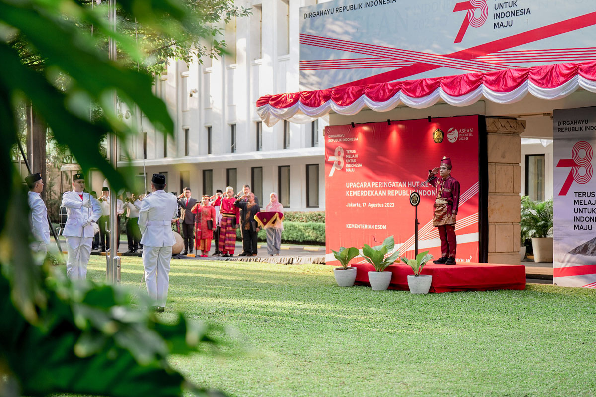 Keluarga Besar Sekretariat Jenderal Kementerian Energi dan Sumber Daya Mineral (ESDM) melaksanakan apel upacara peringatan Hari Ulang Tahun Kemerdekaan Republik Indonesia (HUT RI) ke-78 yang tahun ini mengusung tema "Terus Melaju Untuk Indonesia Maju". Dalam arahannya, Sekretaris Jenderal Kementerian ESDM Dadan Kusdiana mengajak seluruh elemen bangsa untuk melaju bersama dan menggelorakan semangat perjuangan yang belum selesai dan HUT RI ini bisa dijadikan momentum untuk itu. Kamis (17/8).