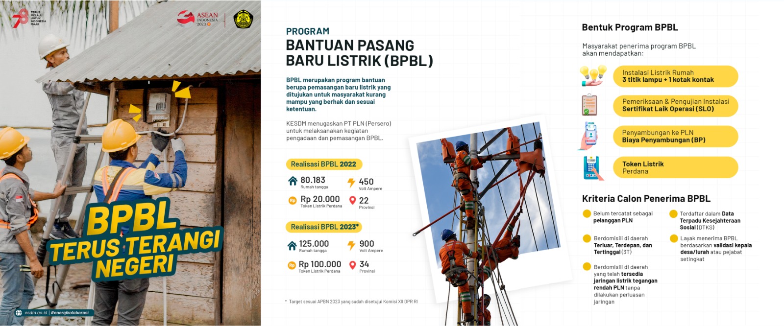 Ia menjelaskan bahwa tahun 2022 lalu Kementerian ESDM menargetkan sebanyak 80.000 rumah tangga akan mendapatkan sambungan listrik gratis melalui program BPBL. Realisasi pada akhir tahun 2022 berhasil menyala melebihi target yaitu sebanyak 80.183 rumah tangga atau 100,2%. Pada tahun 2023 ini, Program BPBL kembali dilanjutkan dengan menyasar 125.000 rumah tangga di seluruh Indonesia.