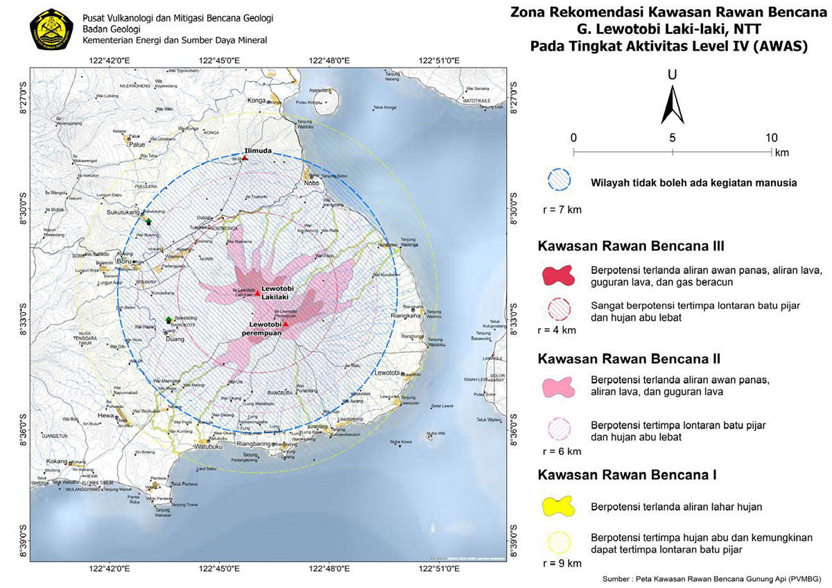 Jakarta - Pusat Vulkanologi dan Mitigasi Bencana Geologi (PVMBG) Badan Geologi Kementerian Energi dan Sumber Daya Mineral (ESDM) menurunkan radius aman Gunung Lewotobi Laki-laki dari sebelumnya 7 km sektoral hingga 8 km ke arah Barat Daya - Barat Laut menjadi radius 7 km dari pusat erupsi. Masyarakat diimbau tetap waspada karena meskipun aktivitas erupsi Gunung Lewotobi Laki-laki menurun, masih terdapat hembusan sedang hingga kuat yang disertai suara gemuruh.