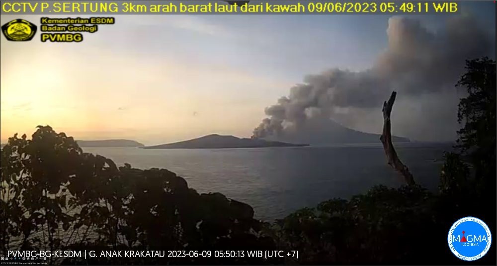 Badan Geologi Kementerian Energi dan Sumber Daya Mineral (ESDM) melaporkan terjadinya erupsi Gunung Anak Krakatau, Lampung pada hari ini, Jumat 9 Juni 2023 pukul 08:46 WIB dengan tinggi kolom abu teramati +- 3.000 m di atas puncak.