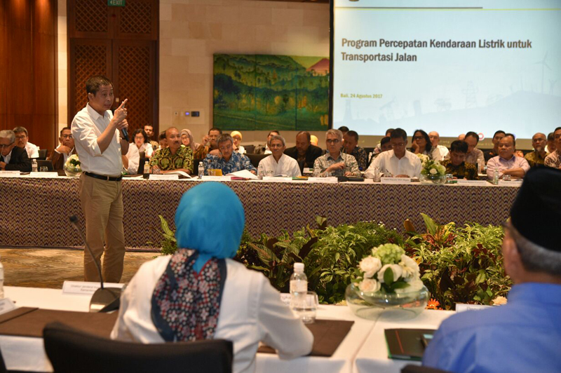 NUSA DUA - Hari ini, Kamis (24/8) Kementerian Eneri Dan Sumber Daya Mineral (ESDM) mengundang instansi-instansi terkait untuk membahas payung hukum percepatan kendaraan listrik untuk sektor transportasi. Dukungan mengalir selain dari Kementerian dan lembaga pemerintahan, kalangan industry automotive, asosiasi dan juga dari akademisi. Program percepatan kendaraan mobil listrik di sektor transportasi mendapat respon positif dari berbagai kalangan antara lain dari kalangan akademisi, dan pengusaha. Pertemuan kali ini merupakan kelanjutan dari 8 pertemuan sebelumnya dan dilakukan dalam format focus group discussion (FGD).Program mobil listrik diharapkan akan membawa manfaat bagi Indonesia seperti, pengurangan emisi dari gas buang sehingga membuat lingkungan lebih berlih, kedua membawa Indonesia menjadi lebih maju, untuk bisnis yang lebih baik, kemandirian energi, hemat devisa, karena itu menurut Menteri ESDM, Ignasius Jonan tinggal dibuat saja roadmapnya bagaimana pelaksanaannya.