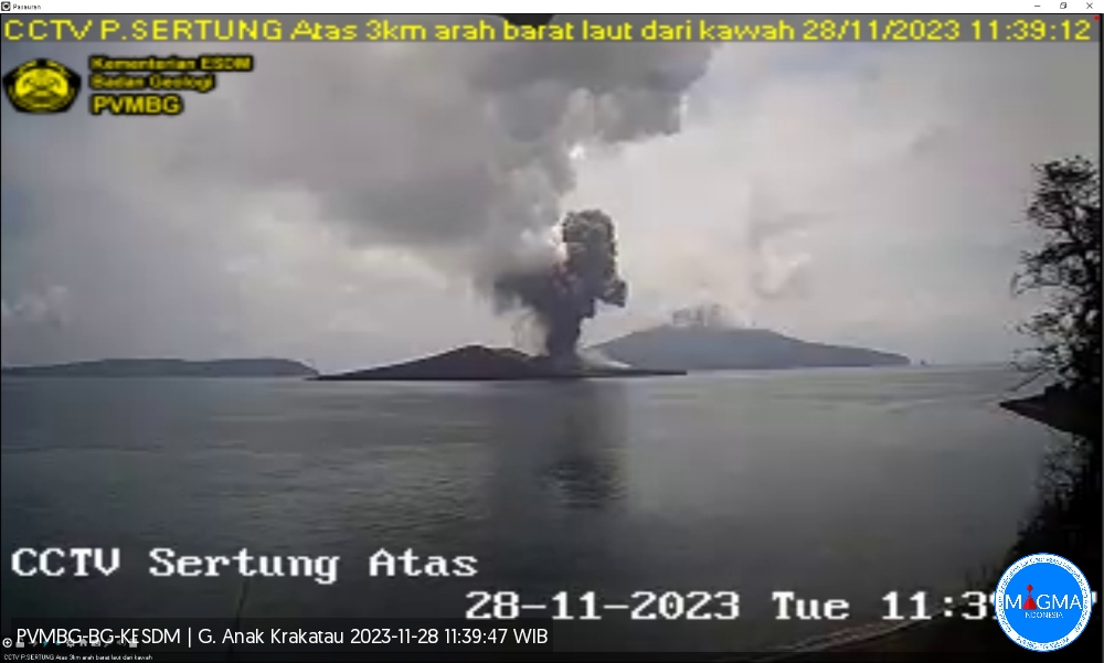 "Hari ini Pusat Vulkanologi dan Mitigasi Bencana Geologi (PVMBG) mencatat telah terjadi erupsi Gunungapi Anak Krakatau sebanyak 7 kali letusan. Letusan terakhir terjadi pada pukul 13:21 WIB dengan tinggi kolom abu teramati +- 1.000 m di atas puncak. Masyarakat dihimbau untuk tidak mendekati puncak Gunung Anak Krakatau atau beraktivitas dalam radius 5 km dari kawah aktif," ujar Kepala PVMBG Badan Geologi Kementerian ESDM Hendra Gunawan di Bandung, Selasa (28/11).