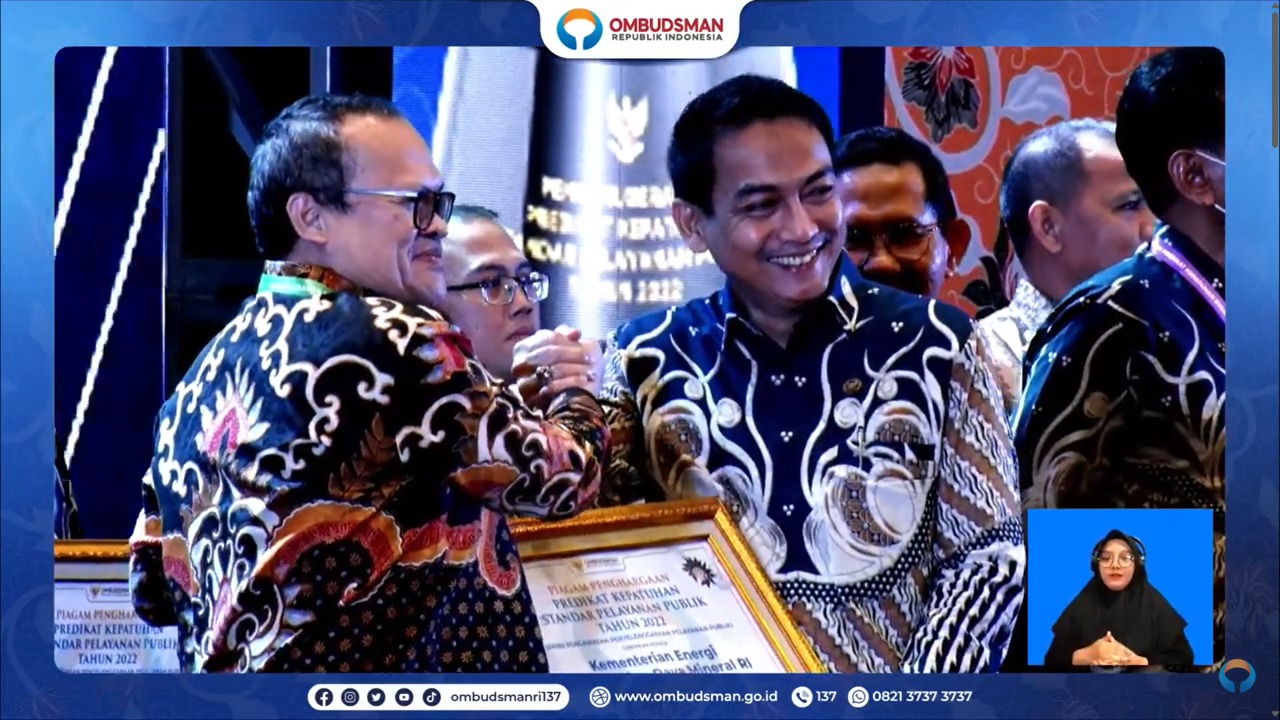 Kementerian Energi dan Sumber Daya Mineral (ESDM) menerima penghargaan dalam Penganugerahan Predikat Kepatuhan Standar Pelayanan Publik Tahun 2022 yang diselenggarakan oleh Ombudsman Republik Indonesia pada Kamis (23/12) di Jakarta. Penghargaan ini diterima langsung oleh Inspektur Jenderal KESDM Akhmad Syakhroza.