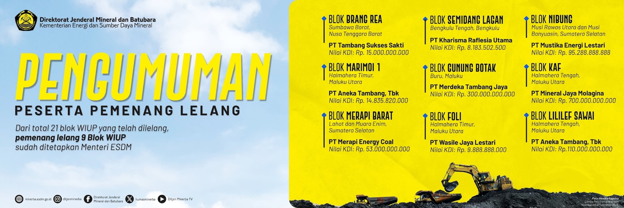 Menteri Energi dan Sumber Daya Mineral (ESDM) Arirfin Tasrif telah menetapkan pemenang lelang atas sembilan Blok Wilayah Izin Usaha Pertambangan (WIUP) Mineral Logam dan Batubara, Rabu (7/2) lalu.