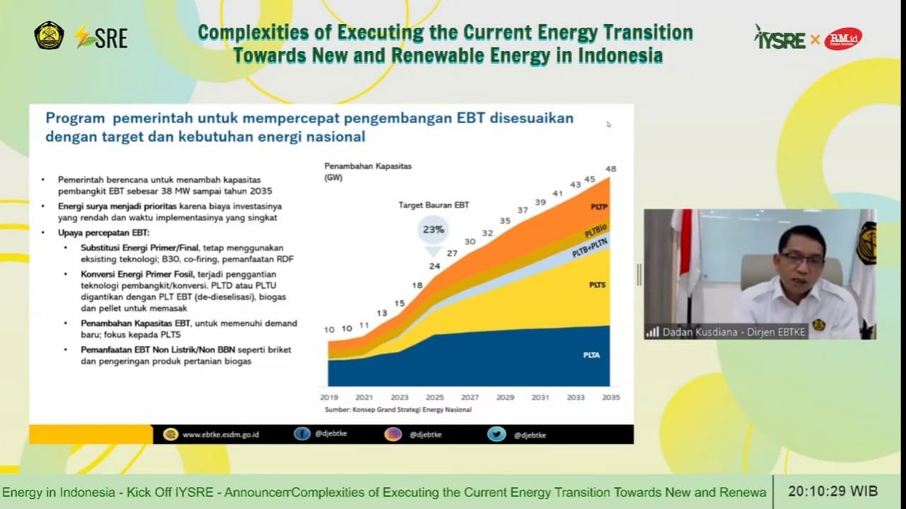 Hal tersebut diungkapkan Dadan sebagai pembicara pada kickoff Webinar Essay Competition dalam rangkaian International Youth Summit Renewable Energy 2021 (IYSRE 2021) yang diadakan oleh Society of Renewable Energy (SRE) yang tersebar di 34 perguruan tinggi di Indonesia.
