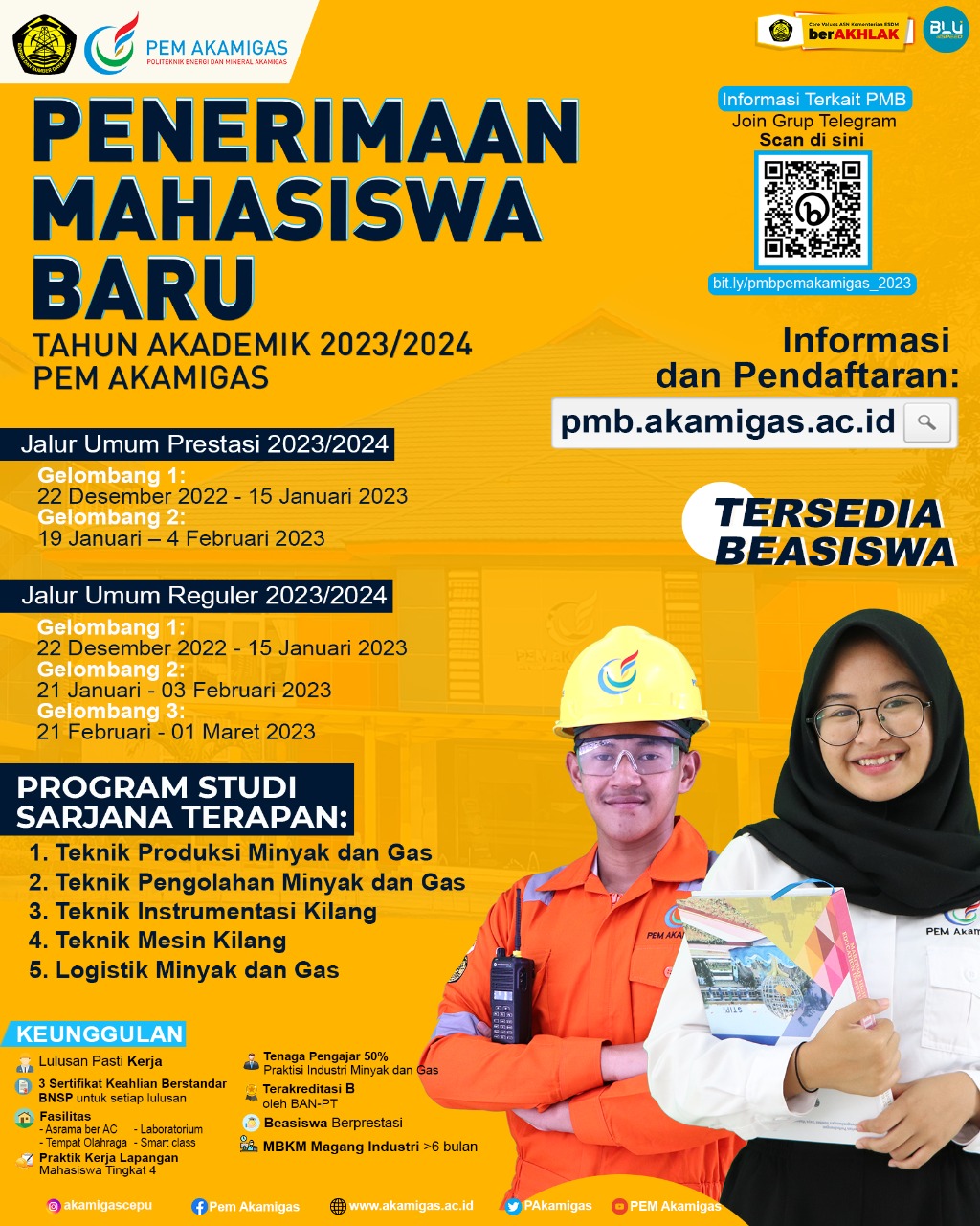 Politeknik Energi dan Mineral (PEM) Akamigas Cepu membuka Seleksi Penerimaan Mahasiswa Baru (PMB) Tahun Akademik (TA) 2023/2024. PEM Akamigas membuka kesempatan bagi putra/putri terbaik bangsa lulusan SMA/MA IPA atau SMK Teknik/Sederajat yang ingin menjadi tenaga profesional di bidang energi dan sumber daya mineral.