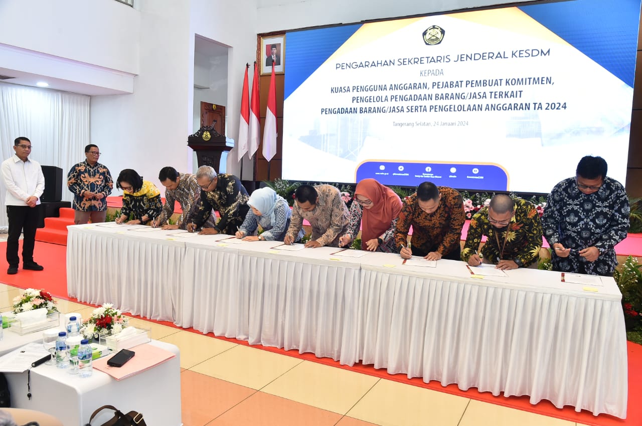 Sebelum pengarahan diberikan, Sekretaris Jenderal Kementerian ESDM menyaksikan Penandatanganan Pakta Integritas oleh Kelompok Kerja Pemilihan Kementerian ESDM Tahun Anggaran 2024.