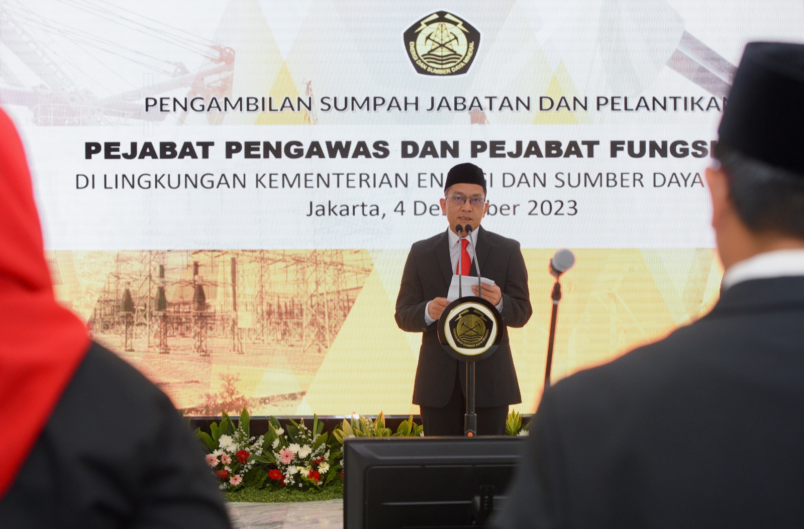 Sekretaris Jenderal Kementerian Energi dan Sumber Daya Mineral (ESDM), Dadan Kusdiana, melantik 1 pejabat pengawas dan 14 pejabat fungsional di lingkungan Kementerian ESDM. Pelantikan berlangsung di Ruang Sarulla Gedung Kementerian ESDM, Jakarta, pada Senin, 4 Desember 2023.