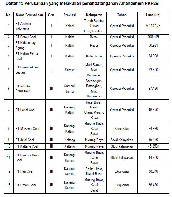 Sejak tahun 2010, pemerintah telah melakukan negosiasi terhadap 68 PKP2B. Dengan penandatanganan amandemen 13 PKP2B pada hari ini, maka sebanyak 50 PKP2B telah diamandemen, sehingga tersisa 18 PKP2B yang akan amandemen.