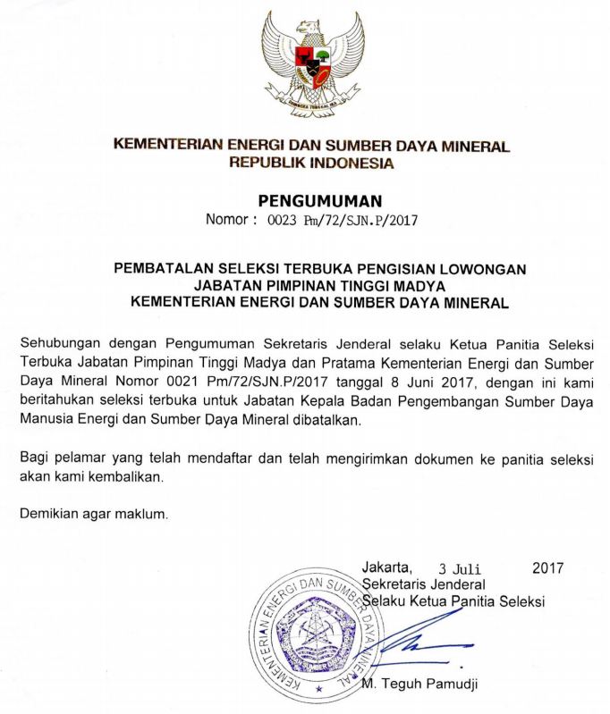 Sehubungan dengan Pengumuman Sekretaris Jenderal selaku Ketua Panitia Seleksi Terbuka Jabatan Pimpinan Tinggi Madya dan Pratama Kementerian Energi dan Sumber Daya Mineral Nomor 0021 Pm/72/SJN.P/2017 tanggal 8 Juni 2017, dengan ini kami beritahukan seleksi terbuka untuk Jabatan Kepala Badan Pengembangan Sumber Daya Manusia Energi dan Sumber Daya Mineral dibatalkan.