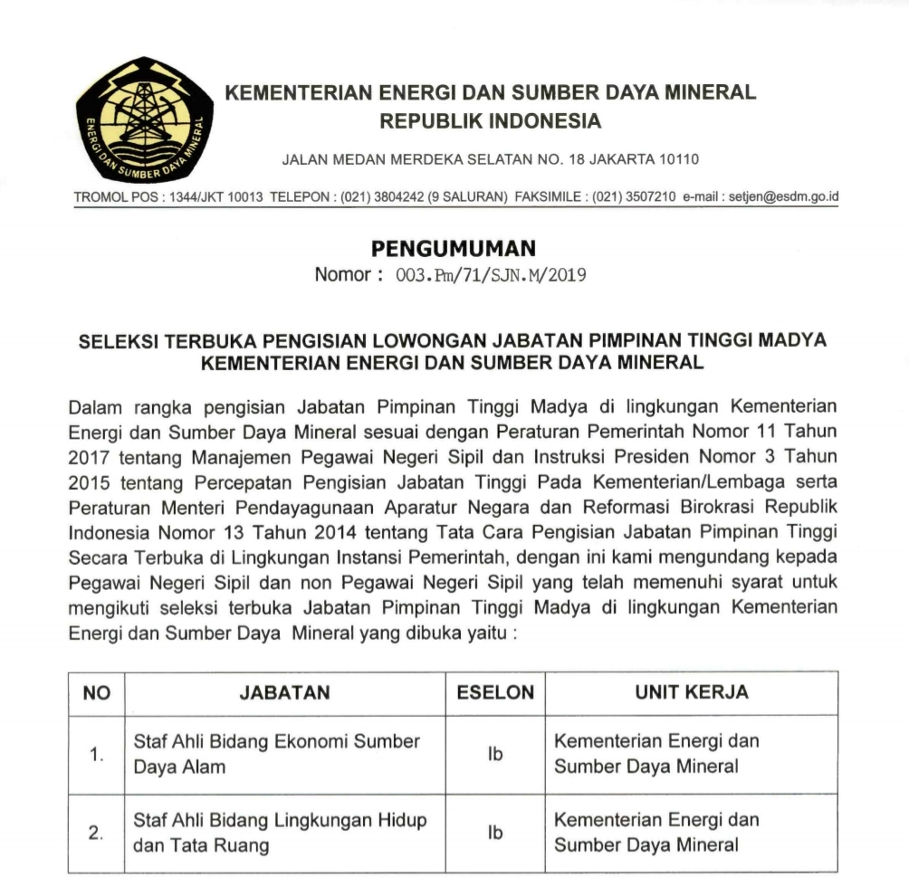 Dengan ini kami mengundang kepada Pegawai Negeri Sipil yang telah memenuhi syarat untuk mengikuti seleksi terbuka jabatan Pimpinan Tinggi Madya di lingkungan Kementerian ESDM, yaitu: