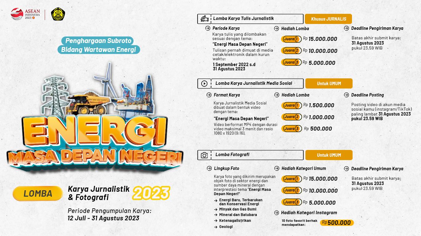 Kementerian Energi dan Sumber Daya Mineral (ESDM) kembali menggelar Lomba Karya Jurnalistik dan Fotografi Tahun 2023 yang merupakan bagian dari kategori Penghargaan Subroto Bidang Wartawan Energi. Tema yang diangkat kali ini adalah "Energi Masa Depan Negeri".
